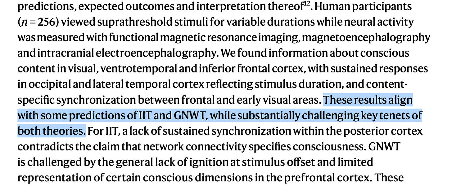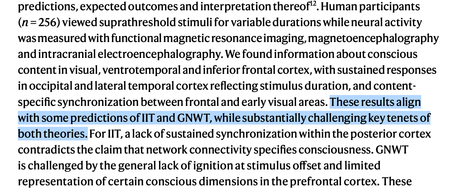 Pour l'IIT, le défi principal est l'absence de synchronisation soutenue au sein du cortex postérieur, une prédiction pourtant centrale de la théorie. Pour GNWT, c'est l'absence d'« ignition » dans le cortex préfrontal à la disparition du stimulus : quand une image s'efface et qu'un écran vide apparaît, l'expérience consciente change, mais l'activité préfrontale prédite par GNWT n'apparaît pas.